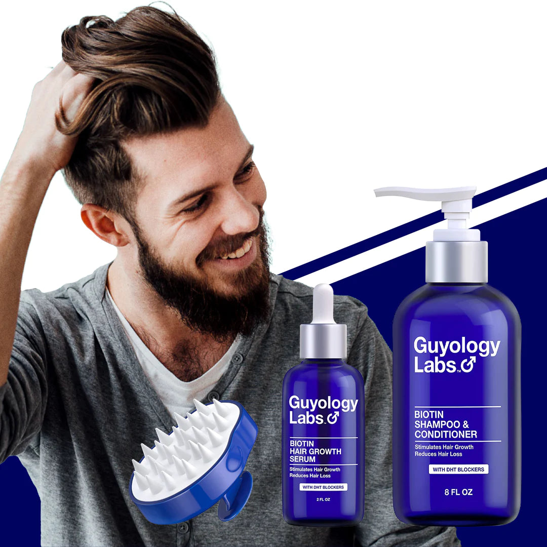 Guyology Labs™ Anti Hair Loss- Hair Growth 3 Step System: Biotin + AnaGain™ Shampoo & Conditioner + Biotin Hair Growth Serum + Scalp Massager Shower Brush